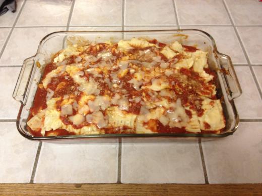 When all of the ravioli are in the pan and topped off with you oh so delicious gravy, sprinkle parmigiano on top and bake at 350 for 10 minuets.